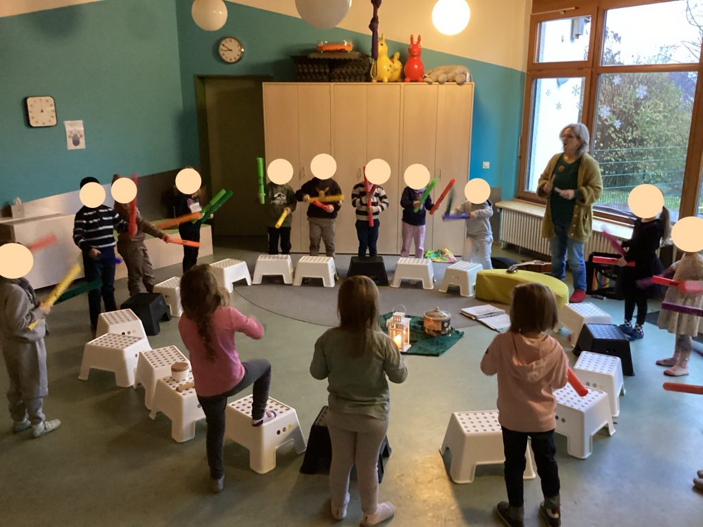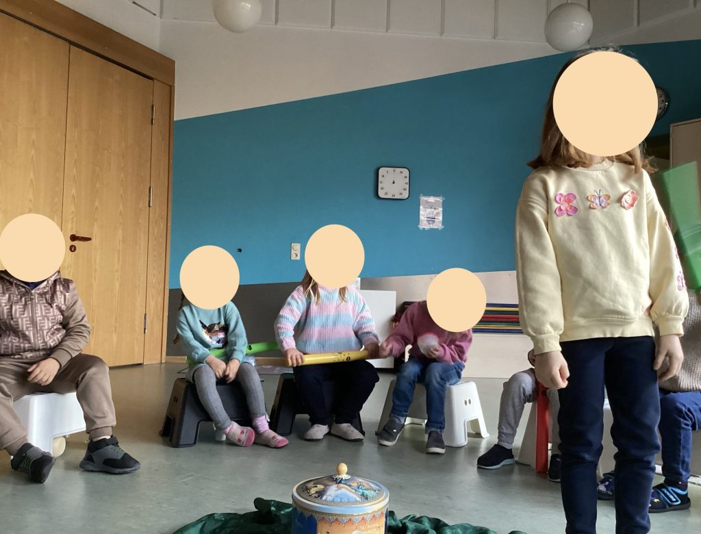 Dieses Spiel haben wir dann noch in einer Variation wiederholt. Die Kinder mussten bei diesem Spiel sehr mutig sein, weil immer ein Kind in der Runde besonders beachtet wurde, wenn es seinen Namen sagte. Gleichzeitig war auch das Rhythmusgefühl und die Koordination gefragt. Jedes Kind hat sich bei diesem Spiel getraut und die herausfordernde Aufgabe gemeistert. Das war ein großartiger Erfolg für jeden und ein gelungener Abschluss. 🤗
